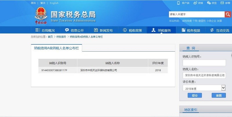 近日,廣東省稅務部門公布了2018年納稅信用評價工作情況,我司憑借誠信納稅的良好信譽,被評為“2018年度納稅信用A級納稅人”,榮獲納稅信用A級榮譽稱號。