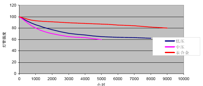 紫外線殺菌器是純水系統(tǒng)一種常用的對水體進(jìn)行殺菌消毒的設(shè)備,紫外線燈管的使用壽命不是指燈管熄滅的時(shí)間,而是指燈管的發(fā)光效率低于消毒殺菌所需要的有效值,無法提供足夠的紫外線輻射量,從而影響殺菌消毒的效果。影響燈管使用壽命的主要原因是燈管內(nèi)部的汞會(huì)慢慢釋放到燈管內(nèi)壁,因此會(huì)逐步影響燈管的紫外線強(qiáng)度。為了保證紫外線殺菌器的殺菌效果,必須定期更換紫外線燈管。各類燈管使用壽命如下圖: