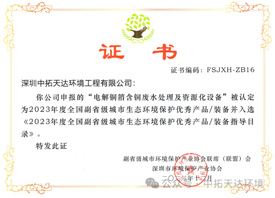 此次入選“2023年度全國副省級城市生態(tài)環(huán)境保護(hù)優(yōu)秀產(chǎn)品/裝備目錄”,是行業(yè)專家對中拓環(huán)境在電解銅箔行業(yè)含銅廢水處理及資源化工作的肯定和認(rèn)可,充分體現(xiàn)了中拓環(huán)境在該領(lǐng)域具有較強(qiáng)的技術(shù)創(chuàng)新能力和項目實施能力。中拓環(huán)境作為工業(yè)水處理一站式解決方案服務(wù)商,將繼續(xù)緊密圍繞客戶的需求,針對重金屬廢水處理的難題將加大技術(shù)攻關(guān),為客戶提供“低耗、高效、智慧”的解決方案,打造更多、更好的產(chǎn)品/裝備。
